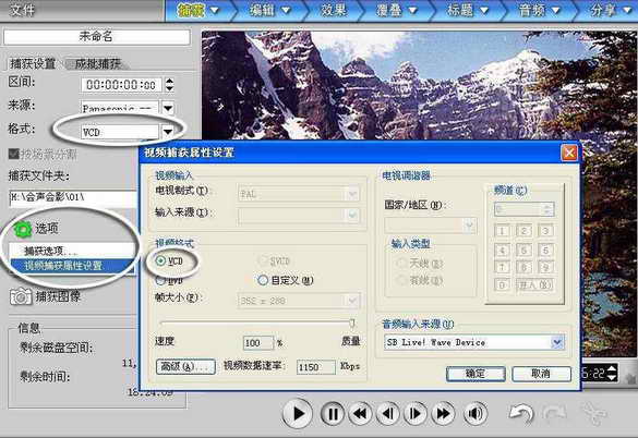 在“选项”下拉菜单中选择“视频捕获属性设置”,出现如图5的对话框,由于前面我们在格式选项中选择的是VCD格式,这里视频输入的“电视制式”默认为PAL(中国大陆电视制式,PAL的帧大小为:352×288),在视频格式选项中这里要保持和前面一致,选VCD格式,否则的话最终效果会受到影响。“速度-质量”滚动条的默认值是80%,如果你的PC速度够快、同时希望清晰度高些,那就拉到100%吧。