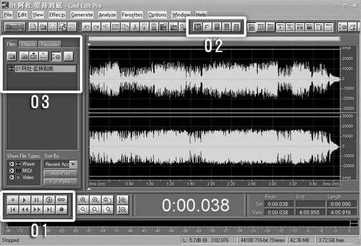 5.接下来开始录音。先启动Cool Edit Pro,按下track1右边的红色R按钮来打开录音功能,然后用MP3播放软件打开这个伴音的02.mp3文件,在此同时要按下录音按钮(图1中的01区域的红色按钮),如果不是同时按,声音会和原来的图像不同步,然后便开始对着麦克风高歌一曲了,唱完后再按下录音按钮停止录音。此时你可以点“播放”按钮看一看刚才自己唱得怎么样,如果觉得不行可以重新录制,直到自己满意为止。