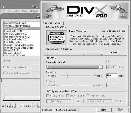 启动VirtualDub,选“File→Open video file”, 打开“阿杜-坚持到底.mpg”,接着选“Video→Compression”,弹出来一个视频编码器的配置窗口,选DivX项点Configure进入DivX配置菜单,根据自己的情况设置,我这儿是默认的780Kbps (图2)。