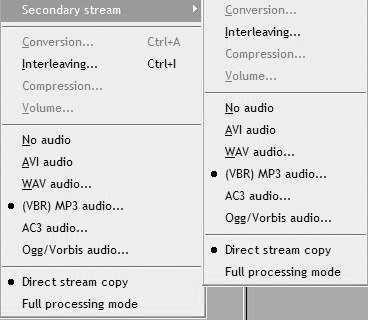 启动NanDub,选“File→Open video file”, 打开“阿杜-坚持到底.avi”,选上“Video→Direct stream copy”项(复制频流),选“Audio→(VBR)MP3 audio”,打开03.mp3文件(此文件为你自己唱的MP3文件),选“Audio→Secondary stream→(VBR)MP3 audio”,打开01.mp3文件(此文件为原唱的声道文件),这两步操作是把原来处理好的音频流附加进AVI文件里面(图3)。 最后选“File→Save As AVI”项,然后输入“坚持到底.avi”开始编码,经过几秒钟的等待文件生成。