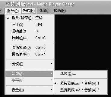 用Media Player Classic打开刚才生成的“坚持到底.avi”,在播放菜单下面的音频项可以分别选取两个音频流,一个是原唱的音频流,一个是你自己唱的音频流,你可以在播放的同时选择不同的音频流,这样对比一下你和原唱的差别,如果你的歌喉不错,你会发现你的就是原版了。至此MPEG4 MTV制作完成,下面来听一听真正属于自己的MTV吧(图4)。