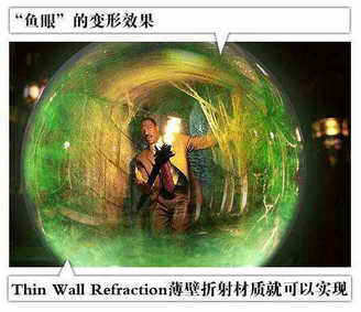 影片中有一个魔女从水晶球中观察主人公的镜头(图2), 关键的CG技术点是:“Thin Wall Refraction薄壁折射材质”!