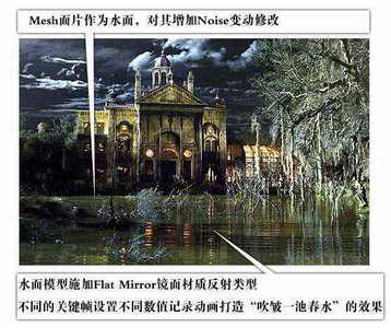 1.模型的建立是非常简单的,如图1。接下来的材质是本制作的关键所在 (CG技术点:“Refletion反射材质属性”)。3DSMAX材质面板中Bump选项中的Noise不可缺少,它负责给整体水晶材质增加光影的多层次变化。水晶的最主要物理特性就是半透明与折射现象。这里的折射将反映周围物体对它的影响,例如片中(图1)的镜头,绿色的魔法球除了自身的色彩设定,你也可以在它的周围添加几盏绿色的Omni泛光灯,或者将四周建筑物设一些绿色自发光的属性。