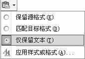 在Word 2002/2003中,只须在网页中复制内容,切换到Word中,单击“粘贴”按钮,网页中所有内容就会原样复制到Word中,这时在复制内容的右下角会出现一个“粘贴选项”按钮,单击按钮右侧的黑三角符号,弹出一个菜单(见图),选择“仅保留文本”即可。
