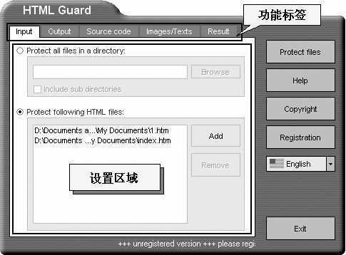 点击主界面中的“Input”标签。选中“Protect all files in a directory”项将对整个文件夹中的网页文件进行加密,若是子文件夹中的文件也需要加密,应将“Include sub directories”项选中。如果想加密单个网页,应选择“Protect following HTML files”项,并使用“Add”按钮来添加。