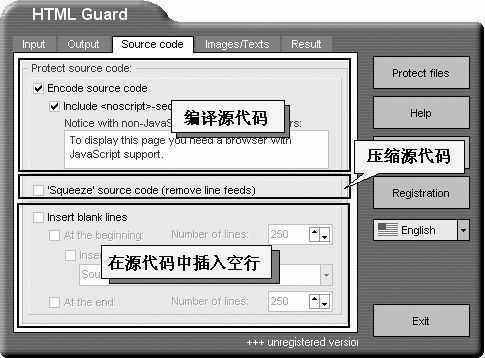 1.Encode source code(编译源代码)。使用该项后,当别人用网页编辑器打开该网页时将显示乱码。由于该编译是在JavaScript技术的基础上进行的,所以编译后的网页必须在支持JavaScript 1.0以上的浏览器上运行。如果你担心有人因此而不能查看你的网页,那么可以将“Include <noscript>section”项选中,并在它下面的栏里添加提示。例如:想正常查看该网页,则必须有支持JavaScript 1.0以上的浏览器。