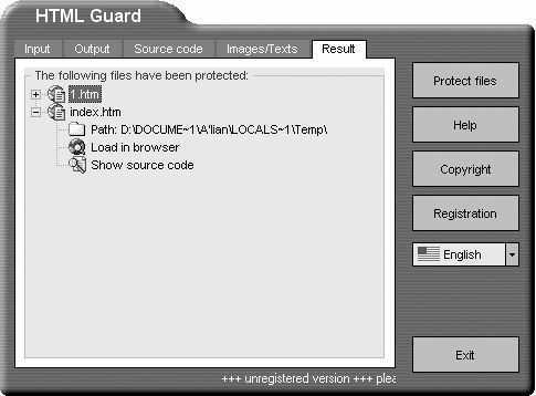 点击界面右侧的“Protect files”按钮,即可完成网页文件的加密(如果弹出警告窗口,点击“Continue”按钮继续工作)。然后在“Result”标签中点击要查看的网页,在展开项中选择“Load in browser”来查看加密后的效果。当然你也可以使用展开项里的“Path”和“Show source code”命令来打开加密后文件所存放的文件夹以及查看加密后的源代码(如图3)。