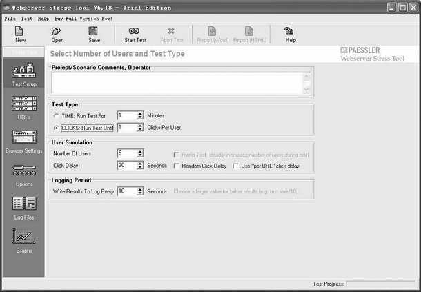 在界面左侧的“Stress Test”列表中点击“Test Setup”按钮,查看右侧设置视图(图1)。在“Project/Scenario Comments,Operator”项目中设置相关的注释信息。“Test Type”项目设置测试类型。我们再查看“User Simulation”项目,“Number Of Users”设置模拟访问者的人数;“Click Delay”设置指定的时间间隔;“Logging Period”项目设置每隔多长时间记录日志。