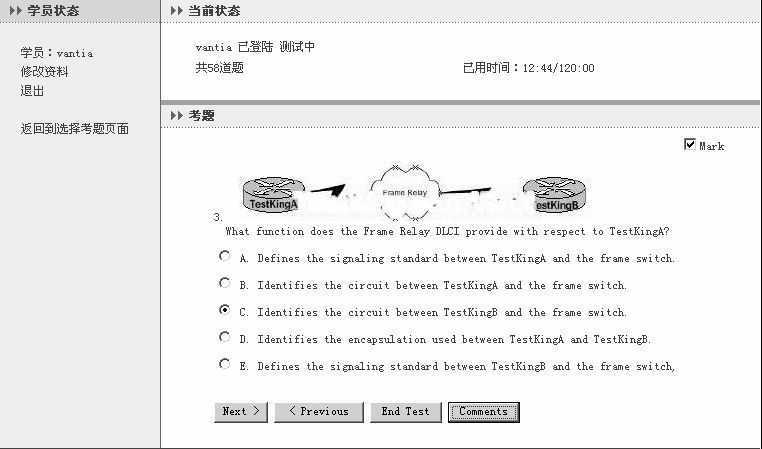 第三步,在试题测试窗口中,选择你的答案(见图),点击“Next”按钮进行下一题的选择,点击“Comments”按钮可以查看到答案及相应的注释。最后,在做完所有的题目后,点击“End Test”按钮来结束测试。