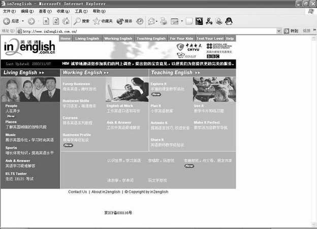 在浏览器地址栏中键入www.in2english.com.cn进入该网站(图1)。可以看出网站设计了多种交互性强,且寓教于乐的游戏和练习活动,例如Flash动画、Flash游戏、唱歌学英语、电子邮件游戏、教学游戏卡片下载等,更新也非常快。