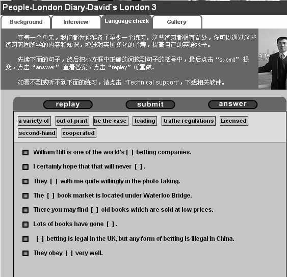 这部分的内容学习完后,我们就可以点击“Language check”标签,测试一下自己刚才的学习效果了(图2)。测试方式很简单,只要把小方框中的词拖到句子的括号中,然后点击“submit” 提交,或者点击“answer”查看答案,也可以点击“replay”重做。测试完以后可以轻松一下,来个劳逸结合,到“Gallery”中看看作者在英国拍摄的一些真实的照片,透过这些图片,我们可以从另外一个侧面了解英国的社会、文化习俗以及众生百态。随着作者完成了他的伦敦之行,你一定会惊喜的发现自己英语水平也在不知不觉中得到了很到的提高。而且,整个过程并感觉不到一丝的枯燥和乏味。