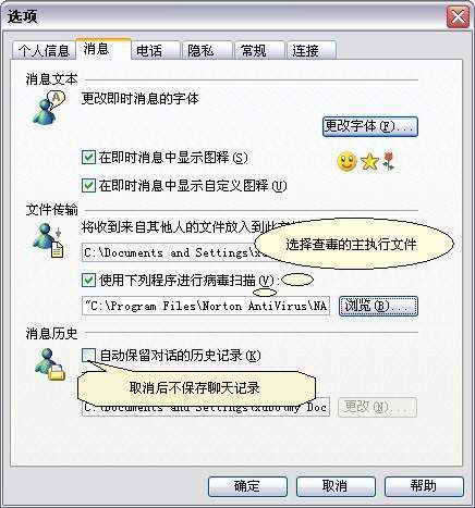 从6.0版开始,MSN Messenger自身也提供了类似的功能,在“选项”窗口,切换到“消息”页面,勾选“使用下列程序进行病毒扫描”,然后单击“浏览”按钮,选择查杀病毒的主执行文件。