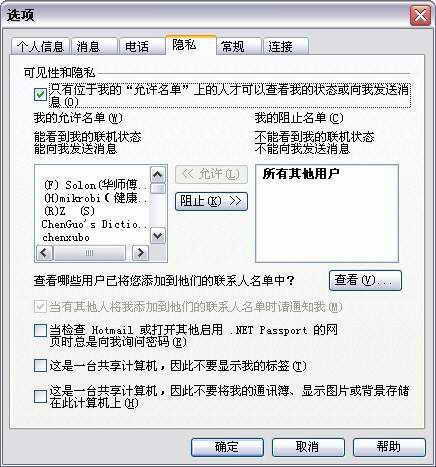 “林子大了,什么鸟都有”,对于那些喜欢发送垃圾或不安全信息的人,当然是毫不犹豫地将他们加入到黑名单中。打开“选项”窗口,切换到“隐私”页面(图2),选中你要阻止的名单,然后单击“阻止”按钮,加入到右侧的阻止名单列表中,最后,要记住勾选上方的“只有位于……向我发送消息”选项。