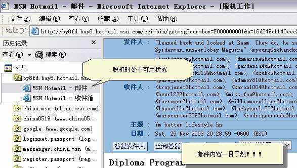 MSN Messenger和Hotmail的“无缝”集成,对于经常使用Hotmail邮箱的朋友实在是太方便了,但经过笔者的观察(注:笔者的系统是Windows XP SP1+IE 6 SP1+MSN Messenger 6.1)发现在Web页面打开邮件后,相关的历史记录还将处于可查看状态,换句话说,别人只要利用这些记录,但可脱机查看到你原来浏览过的邮件内容(图3)。