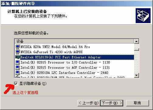 依次点击“控制面板→系统→硬件→硬件向导→卸载/拔掉设备→卸载设备”,再选中“显示隐藏设备”复选框(图2),在硬件列表中找到自己的网卡设备,选择并卸载该设备即可。卸载完成之后,再重新启动,系统会自动扫描到新硬件并进行安装,根本不用开机箱换PCI插槽。