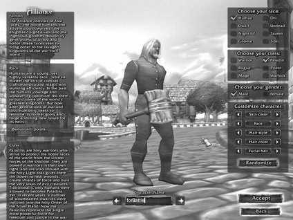 泄漏出的Alpha版,内容最充分的部分是《魔兽世界》的人物创建界面,整个界面都是3D背景,人物也是动态而非静态的。该界面中间是人物模型;右边是具体选项,分四层,第一层是8大种族,第二层是5大职业,第三层是性别,第四层是人物外形包括体型,发型等等;左边是相应种族和职业的介绍文字。随着玩家在右边的具体选项不同,中间的人物模型也会动态的改变,同一个种族的不同职业,同职业的不同种族都有风格各异的外表,再加上外形细节的调整,整个《魔兽世界》里肯定有几千种完全不同的人物。