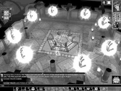 在这里看到一个古怪的装置,似乎是控制桥的东西,通过知识(Lore)检定后才能看清按钮的作用,这里需要的是把面板上的四条竖线连成一条直线,然后按下开关,桥出现了。上去后遇到派来对付你的黑暗精灵战队,消灭之进入眼魔洞穴。这里的眼魔不爱废话,见面就打,一路杀过去消灭眼魔首领。途中有一个Low Tunnels可以下去,那里是死魔法区,任何魔法都无法生效,向左走,有扇门通过施法辨识(Spellcraft)辨认门前机器的作用,打开门,走不远看到一根大方尖柱,地上四面有四列符号,看后发现最靠近方尖柱的符号是固定的,按照这个固定的符号把该列的符号变为一致,四列都改好后死魔法效果消失,在方尖柱上拿到方尖柱之核,可以使用产生死魔法区的效果。注意最后爬上来的时候会受到眼魔的包围。