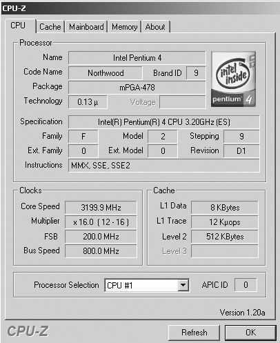 P4 EE的起跳频率为3.2GHz,以后还会有更高频率的型号。不过由于本身制程的限制,以及增加的2MB缓存会大大提升P4 EE的功耗,因此P4 EE的极限频率不会超过3.4GHz很多。运行CPU-z的情况见图2和图3。