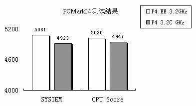 PCMark04主要模拟的是用户进行常用的办公、图形处理、音频视频,以及磁盘读写、扫描的运行环境,P4 EE在PCMark04中表现得比P4 C强一点点,采用P4 EE 3.2GHz的系统整体性能得分比P4 3.2C GHz要高3.2%,而单独的CPU得分,P4 EE比P4 C高出1.6%。此项测试中,P4 EE相对P4 C的性能提升不算很明显。