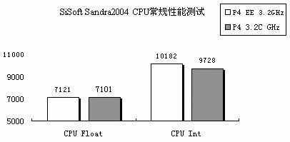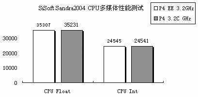 SiSoft Sandra2004的测试结果与PCMark04类似,在常规的CPU运算测试里,P4 EE只在整数运算方面相对P4 C有4.6%的性能提升,而在浮点运算方面与P4 C几乎没有差距。多媒体运算能力方面,P4 EE的得分与P4 C更是旗鼓相当,两者基于SSE2的浮点运算测试得分差距只有76分,0.2%的差距完全可以认为在误差范围内。