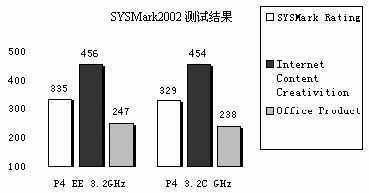 原本我们预计P4 EE会在Internet Content Creativition项目中明显超过P4 C,不过根据测试结果来看,P4 EE的优势还是非常弱,看来增加2MB 三级缓存带来的相对性能提升并不如把二级缓存从128KB增加到256KB带来的相对性能提升明显,不过我们也看到在注重磁盘性能的Office Product中,P4 EE的大容量缓存对于磁盘性能的益处也是比较明显的,因此也带来了一定的分数提升,大概有3.7%的优势。