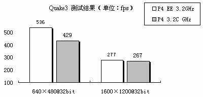 Quake3测试里,P4 EE的优势非常明显。在低分辨率下,游戏对于显卡的要求不高,因此基本上完全依赖CPU的运算能力,在640×480@32bit环境下,P4 EE达到了536fps的好成绩,超过P4 C大约25%,可以说是隔代CPU的差距了。高分辨率下,虽然受到系统中其他配件的制约,P4 EE得分仍然超过P4 C 3.7%。