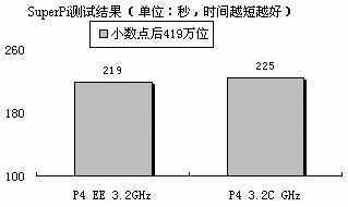 本项测试完全就是考验CPU的浮点运算,P4 EE拥有的大容量缓存发挥了一定作用,计算圆周率到小数点后419万位只需要219秒,比P4 C快了2.2%。差距不算大,这样的计算对于处理器的频率更敏感,而缓存带来的性能提升相对不太明显。