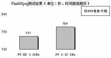 FlaskMpeg用来考查CPU在视频压缩编码方面的性能。P4 EE完成整个压缩只用了737秒,比P4 C快了7%左右。看来增加三级缓存还是对这方面的应用有一定的帮助。