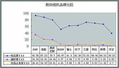 在市场占有率调查中,SONY占26.01%、佳能占18.33%、联想占11.32%和奥林巴斯占10.51%。这三者是目前数码相机市场上的强势品牌,他们都拥有很高的市场知名度。由于数码相机产品处于生命周期的成长期阶段,各种品牌的市场地位还不稳定,随着市场竞争的加剧,市场份额的变动必将造就出市场的领导品牌。