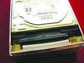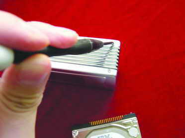 首先,我用螺丝刀卸掉数码相机伴侣外壳后盖的四颗螺丝(图2),打开后便看到一条暴露在外的IDE线(图3)。再用准备好的笔记本电脑硬盘插入IDE线,把硬盘轻轻放入仓内。这个过程中需要注意的是,插入IDE线的硬盘在放到数码相机伴侣仓时,我们会感到IDE线长了一些,这样放进仓内就显得麻烦。只要用螺丝刀把IDE线中部轻轻挑起,让IDE线成拱形,这样就可以把硬盘实实地放进仓内了(图4)。拧紧四周的螺丝,安装部分就顺利完成了(图5)。