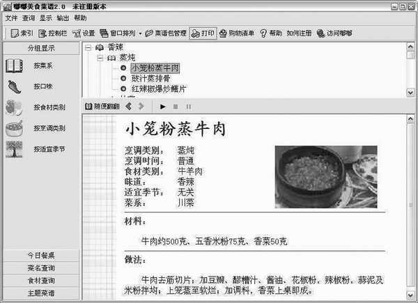 图1所示的窗口就是我们“按口味”方式浏览到的“香辣”类中 “蒸炖”小类中的“小笼粉蒸牛肉”这道菜的相关信息,包括“材料”、“做法”和一些相关属性,按照同样的方法可以浏览所有的菜名资料。