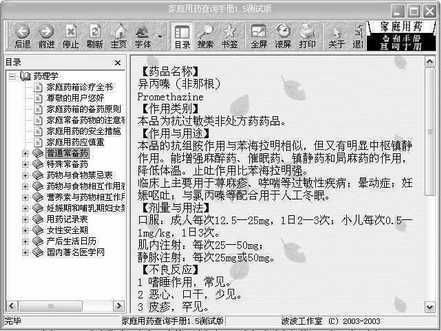 在图2所示的窗口,根据病症选择左侧窗口的某个大类别,按照文字提示一步一步展开其子类别,最后我们就可以找到具体的药物了,找到具体的药物之后,在右侧的窗口中显示了该药物的名称、作用类别、剂量与用法等相关信息,一看便知,然后到药店去买回该药再按照其说明书服用,即可轻松搞定一些小毛病了。