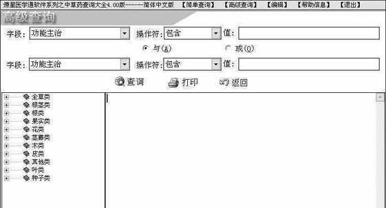 在图3所示的窗口中,我们可以给查询添加很多限制条件,例如我们想查询能“清热解毒”的中药,我们就可以这样来操作:在“字段”框中选择“功能与主治”,然后在“操作符”框中选择“包含”,然后在“值”框中输入“清热解毒”,最后单击“查询”按钮,在下面的列表中就会列出所有的能“清热解毒”的中药,再选择之即可查看其详细信息了。