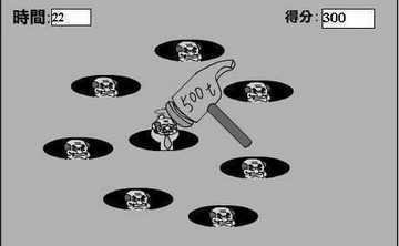 进入页面,点击“开始”即可进入游戏,游戏规则跟“打老鼠”是一样的,当有“老板”露头的时候将鼠标迅速移到相应的位置,点击左键即可用500t的锤子重重地敲在“老板”的头上(图4),随着“咚”地一声闷响,“老板”头上冒出一个大包,抱头钻进地洞,解气吧? 注意,只有鼠标在露头的“老板”上方的时候才能点击鼠标,否则无效。