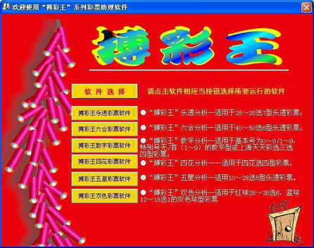 软件简介:《博彩神》豪华的界面在同类软件中是相当突出的(图2)。在功能方面也是相当不错的,它支持全国各地几乎所有的彩票玩法,包括香港地区的六合彩。我们可以在主界面中单击“选择彩票”按钮来选择彩票,每一种彩票都会有详细的介绍,包括选号规则、奖金设定、开奖时间、奖金分配等等。单击界面右下角的“确定”按钮,就可以将这种彩票类型设成当前彩票。通过《博彩神》,我们可以进行多种方式的选号,比如自由选号、随机选号、幸运选号、智能选号,而且运用了多种特别的分析指标,比如星座、生肖、阴阳五行、相生相克等等。同样,该软件还支持各种缩水处理,以及进行各种方式的过滤处理。另外,通过软件的更新功能可以实时更新软件最新的彩票数据。