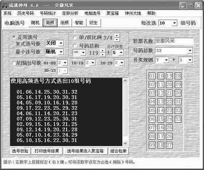 软件简介:《福满神州》适用于全国所有采用“m选n”玩法的福利彩票,可以任意设置m(15~63),第一次使用时,可以选择“系统”菜单下的“新增彩票”来添加彩票,比如安徽风采(33选7玩法),你可以在号码总数中选择33,在开奖号码数中选择7+1,单击“保存彩票基本参数”就可以保存该设置。在“历史号码”中你可以手工添加历史开奖记录;在“号码统计”中你可以对这些号码进行次数统计;在“走势分析”中可以分析中奖号码的走势;在“电脑选号”中还可以设定参数让电脑随机、高频、低频、智能选号(图3)。