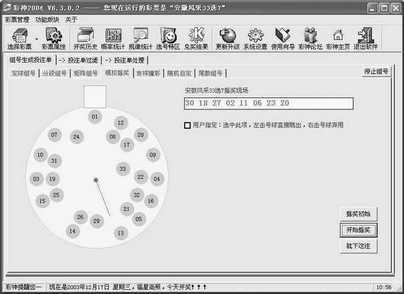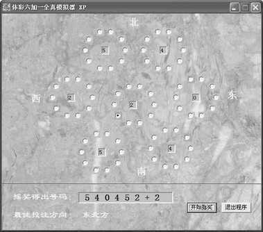 软件简介:《体彩六加一全真模拟器》软件是专门针对传统型6+1体育彩票而设计的,它从物理的角度分析并模拟了高弹性球体的封闭式运动轨迹、弹性及其生号概率,只要单击“开始摇奖”按钮就可快速生成一注号码(图4)。另外,有趣的是据使用说明介绍,软件还融入了中国古代的易经文化,比如天干、地支、奇门等。