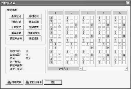 软件简介:关于如何给多注足球彩票缩水一直是困扰广大彩民的问题,《足彩缩水大师》就是一款专门对足球彩票进行优化缩水过滤的软件。它可以实现13保13中、13保12中、13保11中缩水,操作简便,选择竞猜场次之后,选择对应的过滤及缩水条件,单击主界面右侧的“过滤-查看投注单”按钮就可以看到结果(图6)。在结果中你还可以选择其他的智能过滤方式对结果进行过滤,比如条件过滤、超级过滤、概率过滤、合并复式等等。