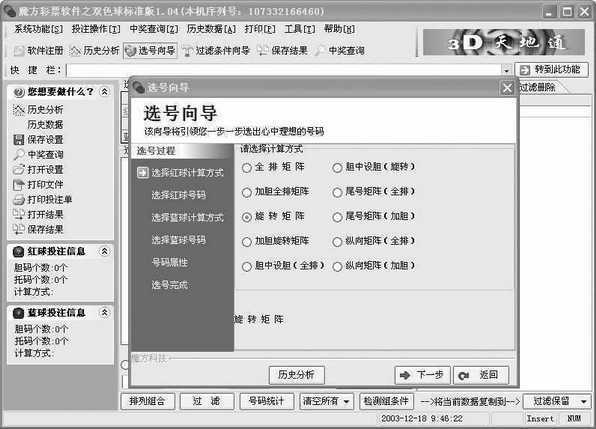 点击工具栏中的“选号向导”按钮,选号向导就会帮助你一步一步选出心中理想的号码。第一步选择计算方式,比如旋转矩阵(图1),单击“下一步”选择红球号码(也可以机选),然后单击“下一步”选择蓝球计算方式,再单击“下一步”选择蓝球号码,然后查看号码属性,最后单击“完成”按钮就完成了选号。