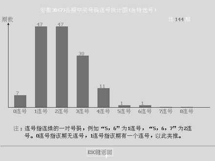 在主窗口中双击“分析统计”按钮,在打开的窗口中就可以选择各种指标进行统计分析,比如笔者想了解各期中奖号码的连号情况,可以这样做:首先选择彩票发行地区,再点击“各期中奖号码连号统计图(含特别号)”,这样就可以看到相应的统计图(图1)了。