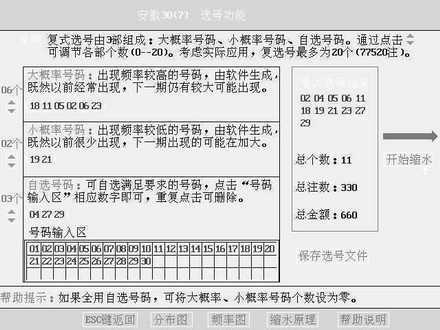 为了对体彩选号进行过滤,你可以在主窗口双击“缩水过滤”按钮,接着在打开的窗口中点击“缩水及过滤”,然后手工选择大概率、小概率以及自选号码,单击“开始缩水”按钮(图2),在选择好缩水条件后(比如“中7保6”、“中7保5”),就可以看到对复式选号进行的缩水结果。最后单击“开始过滤”按钮,就可以选择过滤条件进行结果过滤。