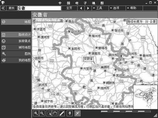在《中国电子地图》主窗口左侧导航栏中选择“地图”,然后在“查找”后面文本框中输入欲查阅的目的地(例如:安徽省)并单击“查找”按钮就可打开目的地安徽的地图了,如图1所示。