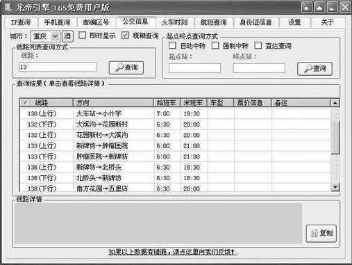 《龙帝引擎》的确是一个功能比较全的信息查询软件,让你可以全方位地查询以上相关信息。火车查询功能就是像我这样普通工薪阶层的朋友比较关心的功能,与此功能差不多的软件还有很多,例如“全国列车查询系统”就是其中一款比较出色的软件,还可以帮助大家查询到哪班到车最经济、最快捷等。