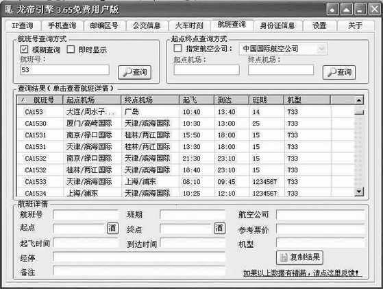 除了以上的交通查询功能,《龙帝引擎》还提供了其他丰富的功能:身份证信息查询、IP地址查询、手机查询、邮编区号查询。选择“身份证信息”标签,我们就可以查询与身份证相关的信息了。例如,可以查询一个身份证号码所对应的户口所在地、年龄、性别,还可以查询一个身份证号码是否为假的,另外,如果你的身份证号码是十五位的,程序还可以告诉你升到18位后应该是多少。