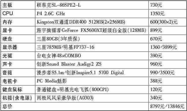 可能大家还注意到,该推荐配置的显示器部分还有明基的17英寸LCD显示器FP-737-16(-16意为16ms响应时间)候选。大家知道,17英寸的LCD可视面积接近19英寸的CRT显示器(之所以没有推荐19英寸的中高档CRT显示器,是因为它们价格不便宜,而且重量和发热量实在是……),且更为节约空间,基本无辐射,16ms的响应时间也足以应付视频播放和大部分游戏。3899元的价位相比现在15英寸LCD的2800元,更具性价比。推荐给经济较为宽裕,且追求完美效果的用户购买。