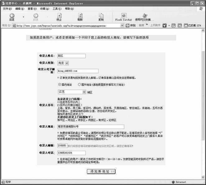 4.接下来需要填写购买物品的收货人信息了。这里需要输入收货人姓名、电子邮箱地址、收货地址、邮编以及联系电话等信息(图2),此时一定要确保信息准确无误,以保证配送中心能够顺利将订购的商品送交到你的手中。