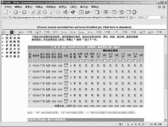 登录“中国南方航空公司”的网站(http://www.cs-air.com/cn/index.asp),执行“网上售票→在线购票”进入订购系统。