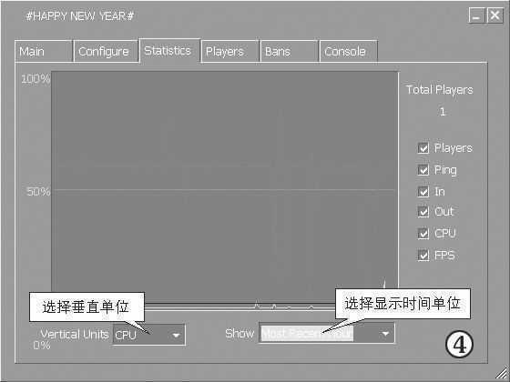 ④Statistics(统计)标签以图形方式显示服务器的运行状态,显示的参数包括Player、Ping、In、Out、CPU和FPS等并可选择不同的显示时间单位。