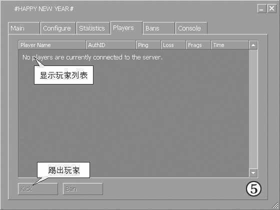 ⑤在Players(玩家)标签上可以管理、查看登录到你的服务器上的玩家。如果你想踢出某个玩家,在玩家列表中选择玩家然后点击“Kick”按钮即可。