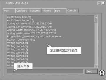 ⑧Console(控制台)是用来显示服务器运行记录的,也可以在这里直接输入命令进行服务器控制,使用cmdlist命令可以列出所有Console指令。
